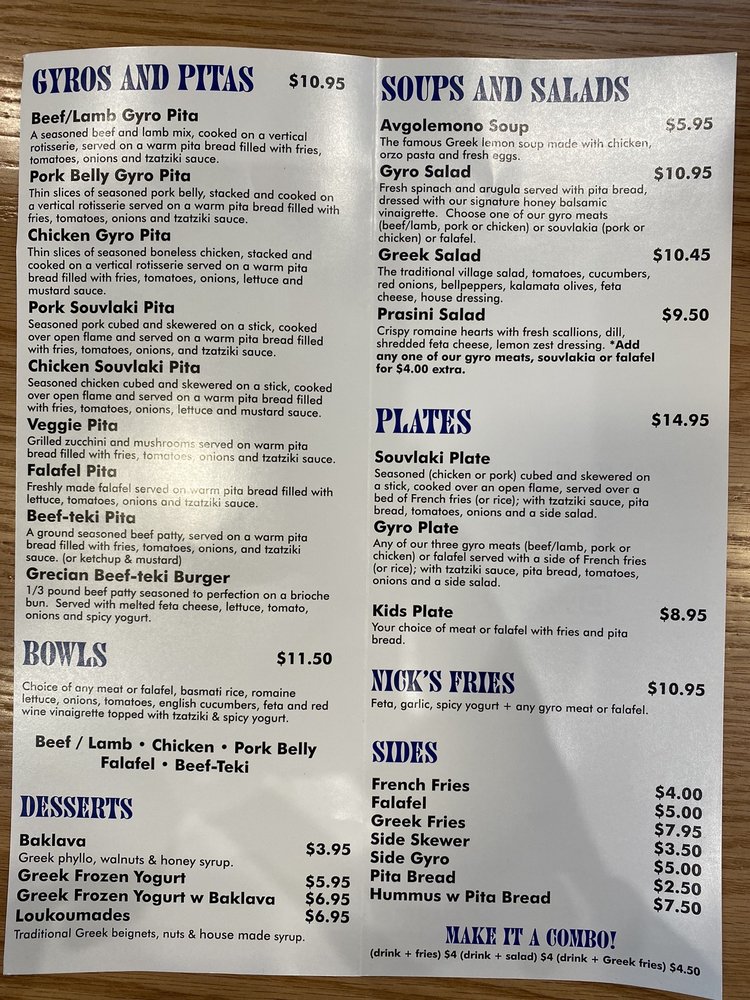 Welcome to Nick The Greek Livermore, where authentic Greek cuisine meets modern flavors. Nestled at 2190 First St, this fast-casual gem specializes in hearty gyros, fresh salads, and comforting soups, crafted to satisfy every palate. Start your culinary journey with their signature Gyro Pita, featuring perfectly seasoned meats served in warm pita, layered with crisp vegetables and tangy sauces. Vegetarians will delight in the Veggie Pita or Falafel Bowl, each offering a burst of flavor.